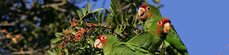 Parrots in California mainly eat seeds, fruits, and nectar from the huge variety of non-native (often tropical) trees and shrubs we have planted around our urban and residential areas. We have provided the food and the nest sites (generally cavities and hollows in trees) that they require. Although most parrots are tropical or subtropical in distribution, they survive in California's dry and (in winter) relatively cool climate because the food resources they need are available year round. Also, they are free from the intense predation pressures (e.g. from nest predation by snakes) that they experience in their native habitats.