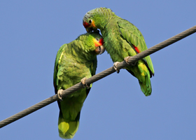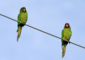 Aratinga are generally seen flying in pairs within small to large flocks. Their calls are higher pitched and more chattery than those of the Amazona.