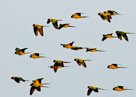 It is not unusual to see a few Aratinga among Amazona flocks. |