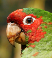 Description: Green body; paler on breast and abdomen; forehead, forecrown and eye area dark red; red feathers scattered on the sides of the head, throat, nape, breast and abdomen; greater under wing-coverts as well as underside of flight and tail feathers goldish or olive-yellow; eye ring whitish; iris brownish-yellow; feet flesh-tone; beak horn-colored. Immatures as adult, but with only a red forehead. Some immatures may have barely visible signs of red.