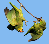 Seen among the larger mixed flocks, though in lesser numbers is the Red-lored Parrot. In 1997, two were documented in the San Gabriel Valley (Mabb 1997a). This species has increased from 2 (Mabb 1997a) to 4-6 in the San Gabriel Valley. Young have been observed being attended by parents, so reproductive recruitment is suspected (Mabb 2002). Breeding has been documented in Orange County (Bowles/Erickson 2007, pers. obs.).